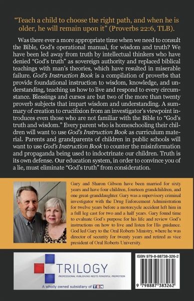"Teach a child to choose the right path, and when he is older, he will remain upon it" (Proverbs 22:6, TLB). Was there ever a more appropriate time when we need to consult the Bible, God's operational manual, for wisdom and truth? We have been led away from truth by intellectual thinkers who have denied "God's truth" as sovereign authority and replaced biblical teachings with man's theories, which have resulted in miserable failure. God's Instruction Book is a compilation of proverbs that provide foundational instruction to wisdom, knowledge, and understanding, teaching us how to live and respond to every circumstance. Blessings and curses are but two of the more than twenty proverb subjects that impart wisdom and understanding. A summary of creation to crucifixion from an investigator's viewpoint introduces even those who are not familiar with the Bible to "God's truth and wisdom." Every parent who is homeschooling their children will want to use God's Instruction Book as curriculum material. Parents and grandparents of children in public schools will want to use God's Instruction Book to counter the misinformation and propaganda being used to indoctrinate our children. Truth is its own defense. Our education system, in order to convince you of a lie, must eliminate "God's truth" from consideration.