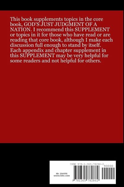 This book is a collection of 12 appendices and 4 chapter supplements to GOD'S JUST JUDGMENT OF A NATION. This SUPPLEMENT or topics in it probably are best for those who have read or are reading that core book, although I make each discussion full enough to stand by itself. Here I call attention to Apx. 4, which shows God's justice to all and mercy to many in His way to judge nations generations after some sins. Apx. 5 shows God's government of the earth from Mt. Zion, and shows requirements for believers in Jesus to participate in this government under King Jesus. Apx. 7 offers unusual insights into God's amazing work to develop His fully Christ-like Church. Apx. 12 provides beautiful insights into God's work to bring together the Church and Israel. A reader of GOD'S JUST JUDGMENT OF A NATION can check the free Preview of the SUPPLEMENT, which contains all of it, and see if other appendices and chapter supplements may help him/her. Each has useful content for some believers.