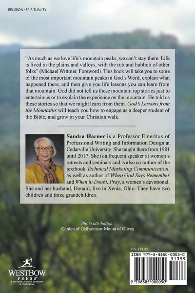 "As much as we love life's mountain peaks, we can't stay there. Life is lived in the plains and valleys, with the rub and hubbub of other folks" (Michael Wittmer, Foreword). This book will take you to some of the most important mountain peaks in God's Word, explain what happened there, and then give you life lessons you can learn from that mountain. God did not tell us these mountain top stories just to entertain us or to explain the experience on the mountain. He told us these stories so that we might learn from them. God's Lessons from the Mountains will teach you how to engage as a deeper student of the Bible, and grow in your Christian walk.