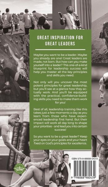 Maybe you want to be a leader. Maybe you already are one! Great leaders are made, not born. But how can you make yourself into a leader? This one-of-a-kind blueprint for leadership success will help you master all the key principles and skills you need. Not only will you uncover the most potent principles for great leadership, but you'll see at a glance how they actually work. And you'll be equipped with the practical, confidence-building skills you need to make them work for you! Best of all, leadership training like this takes just a few moments a day as you learn from those who have experienced leadership first hand. But their impact will work all day long to shape your priorities - and lead you into certain success! So you want to be a great leader? Keep your eyes on your goals and your heart fixed on God's principles for excellence.