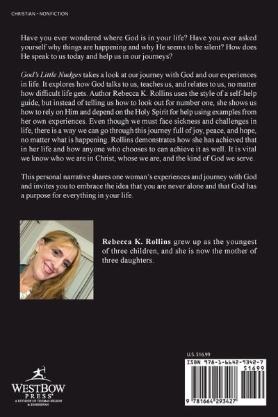 Have you ever wondered where God is in your life? Have you ever asked yourself why things are happening and why He seems to be silent? How does He speak to us today and help us in our journeys? God's Little Nudges takes a look at our journey with God and our experiences in life. It explores how God talks to us, teaches us, and relates to us, no matter how difficult life gets. Author Rebecca K. Rollins uses the style of a self-help guide, but instead of telling us how to look out for number one, she shows us how to rely on Him and depend on the Holy Spirit for help using examples from her own experiences. Even though we must face sickness and challenges in life, there is a way we can go through this journey full of joy, peace, and hope, no matter what is happening. Rollins demonstrates how she has achieved that in her life and how anyone who chooses to can achieve it as well. It is vital we know who we are in Christ, whose we are, and the kind of God we serve. This personal narrative shares one woman's experiences and journey with God and invites you to embrace the idea that you are never alone and that God has a purpose for everything in your life.