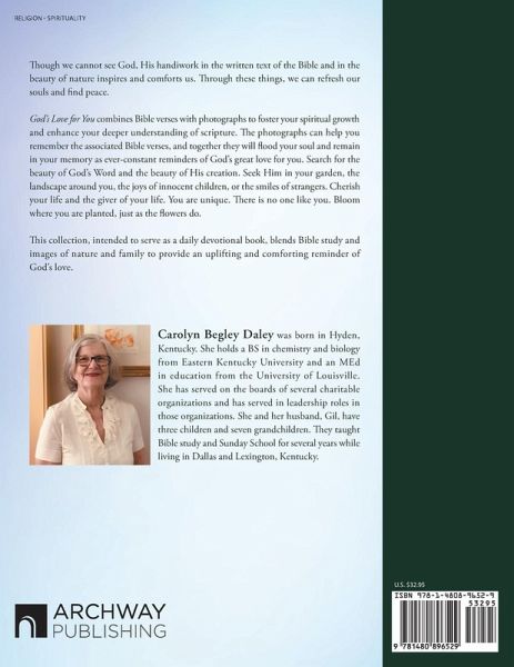 "God's Love For You A Pictorial Devotional" received an Honorable Mention in the non-fiction category for the New York Book Festival. "God's Love for You: A Pictorial Devotional", is an Honorable Mention in the non fiction category of the New England Book Festival. "God's Love for You: A Pictorial Devotional" is a Silver Award Winner of the October 2021 Literary Titan Book Awards. "God's Love for You: A Pictorial Devotional" was awarded an Honorary Mention in the London Book Festival. Though we cannot see God, His handiwork in the written text of the Bible and in the beauty of nature inspires and comforts us. Through these things, we can refresh our souls and find peace. God's Love for You combines Bible verses with photographs to foster your spiritual growth and enhance your deeper understanding of scripture. The photographs can help you remember the associated Bible verses, and together they will flood your soul and remain in your memory as ever-constant reminders of God's great love for you. Search for the beauty of God's Word and the beauty of His creation. Seek Him in your garden, the landscape around you, the joys of innocent children, or the smiles of strangers. Cherish your life and the giver of your life. You are unique. There is no one like you. Bloom where you are planted, just as the flowers do. This collection, intended to serve as a daily devotional book, blends Bible study and images of nature and family to provide an uplifting and comforting reminder of God's love.