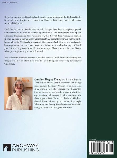 "God's Love For You A Pictorial Devotional" received an Honorable Mention in the non-fiction category for the New York Book Festival. "God's Love for You: A Pictorial Devotional", is an Honorable Mention in the non fiction category of the New England Book Festival. "God's Love for You: A Pictorial Devotional" is a Silver Award Winner of the October 2021 Literary Titan Book Awards. "God's Love for You: A Pictorial Devotional" was awarded an Honorary Mention in the London Book Festival. Though we cannot see God, His handiwork in the written text of the Bible and in the beauty of nature inspires and comforts us. Through these things, we can refresh our souls and find peace. God's Love for You combines Bible verses with photographs to foster your spiritual growth and enhance your deeper understanding of scripture. The photographs can help you remember the associated Bible verses, and together they will flood your soul and remain in your memory as ever-constant reminders of God's great love for you. Search for the beauty of God's Word and the beauty of His creation. Seek Him in your garden, the landscape around you, the joys of innocent children, or the smiles of strangers. Cherish your life and the giver of your life. You are unique. There is no one like you. Bloom where you are planted, just as the flowers do. This collection, intended to serve as a daily devotional book, blends Bible study and images of nature and family to provide an uplifting and comforting reminder of God's love.