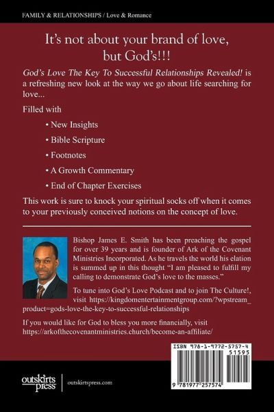 It's not about your brand of love, but God's!!! God's Love The Key To Successful Relationships Revealed! is a refreshing new look at the way we go about life searching for love... Filled with - New Insights - Bible Scripture - Footnotes - A Growth Commentary - End of Chapter Exercises This work is sure to knock your spiritual socks off when it comes to your previously conceived notions on the concept of love. Bishop James E. Smith has been preaching the gospel for over 39 years and is founder of Ark of the Covenant Ministries Incorporated. As he travels the world his elation is summed up in this thought "I am pleased to fulfill my calling to demonstrate God's love to the masses." To tune into God's Love Podcast and to join The Culture!, visit https: //kingdomentertainmentgroup.com/?wpstream_product=gods-love-the-key-to-successful-relationships If you would like for God to bless you more financially, visit https: //arkofthecovenantministries.church/become-an-affiliate