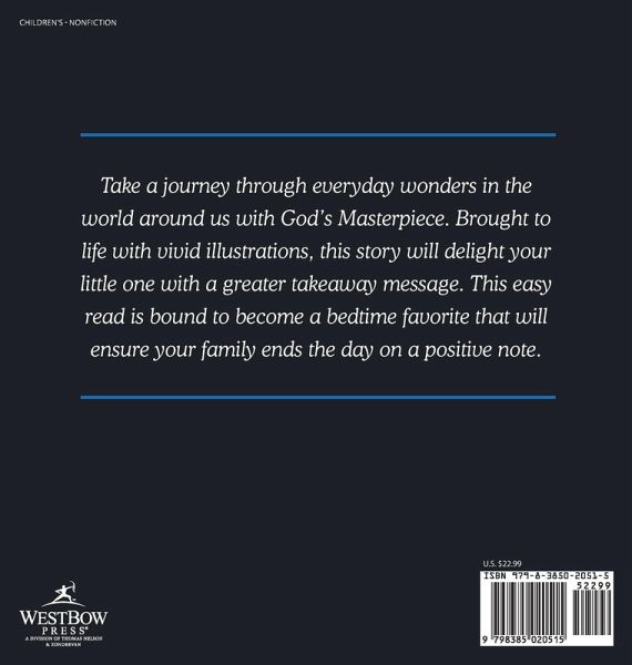 Take a journey through everyday wonders in the world around us with God's Masterpiece. Brought to life with vivid illustrations, this story will delight your little one with a greater takeaway message. This easy read is bound to become a bedtime favorite that will ensure your family ends the day on a positive note.