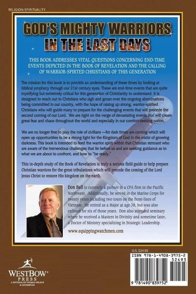 The mission of this book is to provide an understanding of these times by looking at biblical prophecy through twenty-first century eyes. This book is designed to reach out to Christians who sigh and groan over the ongoing abominations being committed in our country, with the hope of raising up strong, strategic leaders who will guide many to prepare for the challenging events that will precede the second coming of our Lord. The book's contents provide us with an in-depth study of the Book of Revelation, designed to be a serious field guide to help prepare Christian warriors for the great tribulations which will precede the coming of the Lord Jesus Christ to restore His kingdom on Earth. We are on the verge of devastating events that will create great fear and chaos throughout the world and especially in our comfort-seeking nation. We are no longer free to play the role of civilians -for dark times are coming which will open up opportunities to be a strong light for the Kingdom of God in the midst of growing darkness. Those who hear the call and seriously prepare will be among the warrior-spirited Christians who will be the Lord's anointed witnesses during the great tribulation.