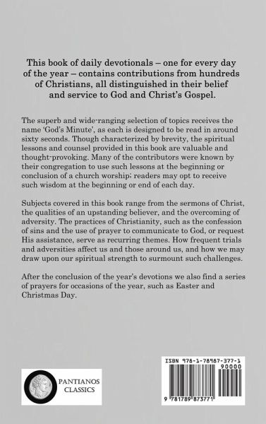 This book of daily devotionals - one for every day of the year - contains contributions from hundreds of Christians, all distinguished in their belief and service to God and Christ's Gospel. The superb and wide-ranging selection of topics receives the name 'God's Minute', as each is designed to be read in around sixty seconds. Though characterized by brevity, the spiritual lessons and counsel provided in this book are valuable and thought-provoking. Many of the contributors were known by their congregation to use such lessons at the beginning or conclusion of a church worship; readers may opt to receive such wisdom at the beginning or end of each day. Subjects covered in this book range from the sermons of Christ, the qualities of an upstanding believer, and the overcoming of adversity. The practices of Christianity, such as the confession of sins and the use of prayer to communicate to God, or request His assistance, serve as recurring themes. How frequent trials and adversities affect us and those around us, and how we may draw upon our spiritual strength to surmount such challenges. After the conclusion of the year's devotions we also find a series of prayers for occasions of the year, such as Easter and Christmas Day.