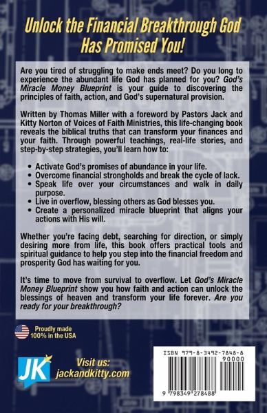 Unlock the Financial Breakthrough God Has Promised You! Are you tired of struggling to make ends meet? Do you long to experience the abundant life God has planned for you? God's Miracle Money Blueprint is your guide to discovering the principles of faith, action, and God's supernatural provision. Written by Thomas Miller with a foreword by Pastors Jack and Kitty Norton of Voices of Faith Ministries, this life-changing book reveals the biblical truths that can transform your finances and your faith. Through powerful teachings, real-life stories, and step-by-step strategies, you'll learn how to: Activate God's promises of abundance in your life. Overcome financial strongholds and break the cycle of lack. Speak life over your circumstances and walk in daily purpose. Live in overflow, blessing others as God blesses you. Create a personalized miracle blueprint that aligns your actions with His will. Whether you're facing debt, searching for direction, or simply desiring more from life, this book offers practical tools and spiritual guidance to help you step into the financial freedom and prosperity God has waiting for you. It's time to move from survival to overflow. Let God's Miracle Money Blueprint show you how faith and action can unlock the blessings of heaven and transform your life forever. Are you ready for your breakthrough?