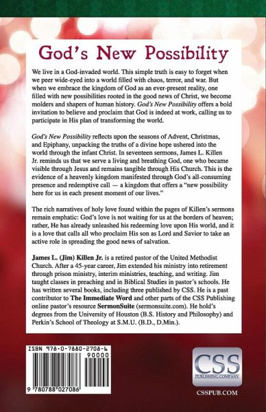 We live in a God-invaded world. This simple truth is easy to forget when we peer wide-eyed into a world filled with chaos, terror, and war. But when we embrace the kingdom of God as an ever-present reality, one filled with new possibilities rooted in the good news of Christ, we become molders and shapers of human history. God's New Possibility offers a bold invitation to believe and proclaim that God is indeed at work, calling us to participate in His plan of transforming the world. God's New Possibility reflects upon the seasons of Advent, Christmas, and Epiphany, unpacking the truths of a divine hope ushered into the world through the infant Christ. In seventeen sermons, James L. Killen Jr. reminds us that we serve a living and breathing God, one who became visible through Jesus and remains tangible through His Church. This is the evidence of a heavenly kingdom manifested through God's all-consuming presence and redemptive call -- a kingdom that offers a "new possibility here for us in each present moment of our lives." The rich narratives of holy love found within the pages of Killen's sermons remain emphatic: God's love is not waiting for us at the borders of heaven; rather, He has already unleashed his redeeming love upon His world, and it is a love that calls all who proclaim His son as Lord and Savior to take an active role in spreading the good news of salvation. James L. (Jim) Killen Jr. is a retired pastor of the United Methodist Church. After a 45-year career, Jim extended his ministry into retirement through prison ministry, interim ministries, teaching, and writing. Jim taught classes in preaching and in Biblical Studies in pastor's schools. He has written several books, including three published by CSS. He is a past contributor to The Immediate Word and other parts of the CSS Publishing online pastor's resource SermonSuite (sermonsuite.com. He holds degrees from the University of Houston (B.S. History and Philosophy) and Perkin's School of Theology at S.M.U. (B.D., D.Min.).