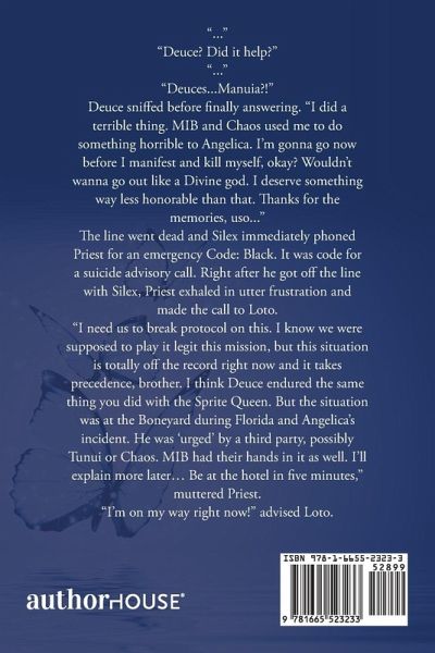 "..." "Deuce? Did it help?" "..." "Deuces...Manuia?!" Deuce sniffed before finally answering. "I did a terrible thing. MIB and Chaos used me to do something horrible to Angelica. I'm gonna go now before I manifest and kill myself, okay? Wouldn't wanna go out like a Divine god. I deserve something way less honorable than that. Thanks for the memories, uso..." The line went dead and Silex immediately phoned Priest for an emergency Code: Black. It was code for a suicide advisory call. Right after he got off the line with Silex, Priest exhaled in utter frustration and made the call to Loto. "I need us to break protocol on this. I know we were supposed to play it legit this mission, but this situation is totally off the record right now and it takes precedence, brother. I think Deuce endured the same thing you did with the Sprite Queen. But the situation was at the Boneyard during Florida and Angelica's incident. He was 'urged' by a third party, possibly Tunui or Chaos. MIB had their hands in it as well. I'll explain more later... Be at the hotel in five minutes," muttered Priest. "I'm on my way right now!" advised Loto.