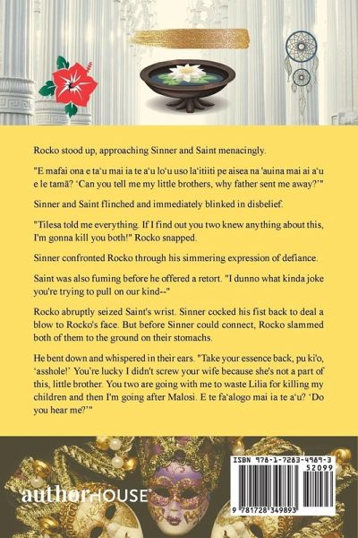 Rocko stood up, approaching Sinner and Saint menacingly. "E mafai ona e tau mai ia te au lou uso laitiiti pe aisea na 'auina mai ai au e le tam? 'Can you tell me my little brothers, why father sent me away?'" Sinner and Saint flinched and immediately blinked in disbelief. "Tilesa told me everything. If I find out you two knew anything about this, I'm gonna kill you both!" Rocko snapped. Sinner confronted Rocko through his simmering expression of defiance. Saint was also fuming before he offered a retort. "I dunno what kinda joke you're trying to pull on our kind--" Rocko abruptly seized Saint's wrist. Sinner cocked his fist back to deal a blow to Rocko's face. But before Sinner could connect, Rocko slammed both of them to the ground on their stomachs. He bent down and whispered in their ears. "Take your essence back, pu ki'o, 'asshole!' You're lucky I didn't screw your wife because she's not a part of this, little brother. You two are going with me to waste Lilia for killing my children and then I'm going after Malosi. E te faalogo mai ia te au? 'Do you hear me?'"