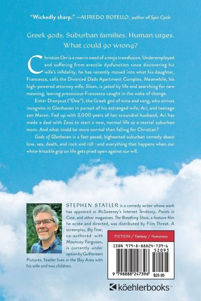 "Hilarious . . . Statler's wit and charm are on full display."-Christopher Monks, editor of McSweeney's Internet Tendency "A raunchy and fun supernatural comedy with a surprising amount of heart." -Kirkus Reviews "Percy Jackson for adults!"-John Zilcosky, author of Kafka's Travels From comedy writer and McSweeney's contributor Stephen Statler comes Gods of Glenhaven, a David Sedaris-meets-Tom Perotta, fast-paced, bighearted comedy about love, sex, death, and rock and roll-and everything that happens when our white-knuckle grip on life gets pried open against our will. When Greek gods sweep into the quaint suburban town of Glenhaven to untangle their messy love lives, the helpless mortals don't stand a chance. Christian Orr, struggling with work and erectile dysfunction after discovering his wife's infidelity, has just moved into what his daughter Francesca calls the Divorced Dads Apartment Complex. His high-powered attorney ex, Sloan, is jaded and restless, leaving precocious Francesca caught in the crosscurrents of change. Enter Dionysus-"Dee"-the god of wine, sex, and questionable decisions, who shows up searching for his estranged wife Ari and their teenage son Maron. After three thousand years of Dee's antics, Ari has had enough. She's struck a deal with Zeus to start fresh-as a mortal suburban mom. And what's more normal than falling for a regular guy like Christian? If only Dee would stop tearing through Glenhaven in his quest to win her back. Drunk on Dee's wine, the residents of Glenhaven form chanting covens in the woods, participate in ecstatic rituals, and experience divine revelations-all while Led Zeppelin's "Whole Lotta Love" loops faintly in the background of their lives. Gods of Glenhaven is a hilarious, poignant, and confronting novel about the universal fears and follies of the human condition, and the joy and freedom we can experience by letting go.