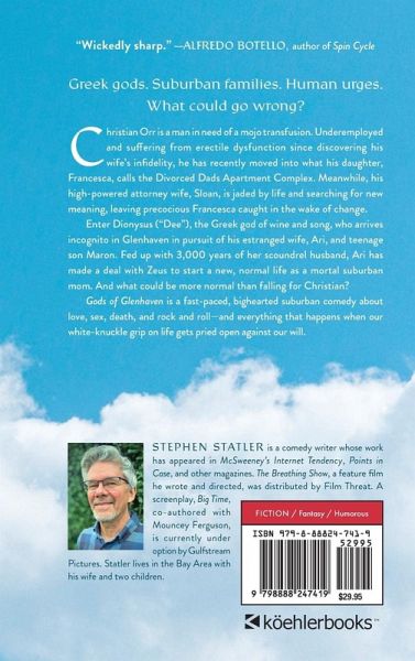 "Hilarious . . . Statler's wit and charm are on full display."-Christopher Monks, editor of McSweeney's Internet Tendency "A raunchy and fun supernatural comedy with a surprising amount of heart." -Kirkus Reviews "Percy Jackson for adults!"-John Zilcosky, author of Kafka's Travels From comedy writer and McSweeney's contributor Stephen Statler comes Gods of Glenhaven, a David Sedaris-meets-Tom Perotta, fast-paced, bighearted comedy about love, sex, death, and rock and roll-and everything that happens when our white-knuckle grip on life gets pried open against our will. When Greek gods sweep into the quaint suburban town of Glenhaven to untangle their messy love lives, the helpless mortals don't stand a chance. Christian Orr, struggling with work and erectile dysfunction after discovering his wife's infidelity, has just moved into what his daughter Francesca calls the Divorced Dads Apartment Complex. His high-powered attorney ex, Sloan, is jaded and restless, leaving precocious Francesca caught in the crosscurrents of change. Enter Dionysus-"Dee"-the god of wine, sex, and questionable decisions, who shows up searching for his estranged wife Ari and their teenage son Maron. After three thousand years of Dee's antics, Ari has had enough. She's struck a deal with Zeus to start fresh-as a mortal suburban mom. And what's more normal than falling for a regular guy like Christian? If only Dee would stop tearing through Glenhaven in his quest to win her back. Drunk on Dee's wine, the residents of Glenhaven form chanting covens in the woods, participate in ecstatic rituals, and experience divine revelations-all while Led Zeppelin's "Whole Lotta Love" loops faintly in the background of their lives. Gods of Glenhaven is a hilarious, poignant, and confronting novel about the universal fears and follies of the human condition, and the joy and freedom we can experience by letting go.