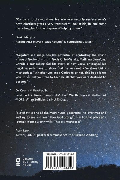 In this story of restoration, Matthew Simmons breaks free of constraints and dives headlong into his journey from failure to faith. Negative self-image has a way of contorting the divine image of God within each of us. In God's Only Mistake, Matthew unveils his compelling, real-life story of how Jesus untangled his negative self-image to show that he was not "a mistake", but a masterpiece. Whether you are a Christian or not, this book is for you. It will help set you free to become all that you were destined to become.