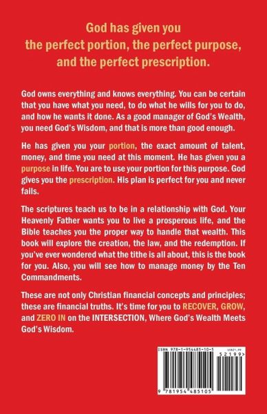 God has given you the perfect portion, the perfect purpose, and the perfect prescription. God owns everything and knows everything. You can be certain that you have what you need, to do what he wills for you to do, and how he wants it done. As a good manager of God's Wealth, you need God's Wisdom, and that is more than good enough. He has given you your portion, the exact amount of talent, money, and time you need at this moment. He had given you a purpose in life. You are to use your portion for this purpose. God gives you the prescription. His plan is perfect for you and never fails. The scriptures teach us to be in a relationship with God. Your Heavenly Father wants you to live a prosperous life, and the Bible teaches you the proper way to handle that wealth. This book will explore the creation, the law, and the redemption. If you've ever wondered what the tithe is all about, this is the book for you. Also, you will see how to manage money by the Ten Commandments. These are not only Christian financial concepts and principles; these are financial truths. It's time for you to RECOVER, GROW, and ZERO IN on the INTERSECTION, Where God's Wealth Meets God's Wisdom. The INTERSECTION series includes the titles below:Biblical Faith Meets Financial Strategy, 2nd ed. - How to Lay a Solid Foundation for Prosperity God's Ownership Meets Money Management - How to Be a Good and Faithful Steward Divine Provision Meets Generosity Planning - How to Live Life to the Fullest While Richly Giving ...and the following companion for a deeper study:Setting Your Sights on the Intersection - 90-Day Devotional & Journal About the book series: INTERSECTION - Where God's Wealth Meets God's Wisdom Imagine yourself at the shooting range aiming at a target. To ensure your aim is accurate, you look for a calibrated point of reference. There are two engraved lines to give you a single place to focus on when aiming at a target. The two lines cross at this spot and create what is known as crosshairs. Crosshairs are composed of two wires or lines, one parallel and the other perpendicular to the horizon. The area that you are focused on is where the two lines intersect. The objective is to align the crosshairs with the bullseye. Aiming to hit the bullseye requires precision, and using the simple principle of intersecting lines, you can easily pinpoint that target. When peering through the scope of your financial future, the strategy is the same. The two dimensions are God's Wealth (vertical) and God's Wisdom (horizontal). Once you have these two crosshairs in focus and zeroed-in, you can aim right at the center of your target and hit it consistently. If you want to pinpoint your financial destiny, you need to zero-in on your target, not someone else's mark. The simple tool needed for pinpoint accuracy is the crosshairs, and one of the most critical steps is knowing where you are aiming. The blessings come where the two lines meet. Get ready to manage money according to the Word of God and live a prosperous life!