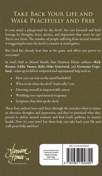 Take Back Your Life and Walk Peacefully and Free Is your mind a playground for the devil? Are you harassed and held hostage by thoughts, fears, anxiety, and depression that won't let up? You're not alone. The number of people suffering from mental torment is staggering because the devil is a master at mind games. But God has already beat him at his game and offers you power to overcome! In God's Path to Mental Health, four Harrison House authors-Rick Renner, Eddie Turner, Kylie Oaks Gatewood, and Germaine Copeland-team up to deliver scriptural and supernatural help such as: How you can win on the mind battlefield What to do when the devil "trash talks" you Dressing yourself in impenetrable armor Wielding your supernatural weaponry Scriptures that shut up the devil These four authors have each been through the trenches when it comes to obsessive thoughts and depression, and they've practiced what they preach to defeat mental torment and find God's pathway to mental health. Now it's your turn! Let them help you take back your life and walk peacefully and free!