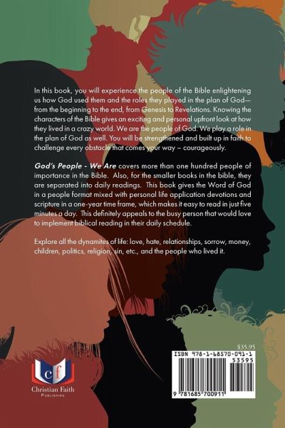 In this book, you will experience the people of the Bible enlightening us how God used them and the roles they played in the plan of God-from the beginning to the end, from Genesis to Revelations. Knowing the characters of the Bible gives an exciting and personal upfront look at how they lived in a crazy world. You will be strengthened and built up in faith to challenge every obstacle that comes your way-courageously. We read about this in Hebrews: By faith we understand that the universe was formed at God's command, so that what is seen was not made out of what was visible. By faith, Abel, Cain, Enoch, Abraham were all part of the foundation of this universe. We are the people of God. We play a role in that plan as well.God's People - We Are covers more than one hundred people of importance in the Bible. The whole book is added for some of the smaller books, separated into daily readings. It gives the Word of God in a people format mixed with personal life application and devotion in a one-year time frame, which makes it an easy daily five-minute reading. This definitely appeals to the busy person that would love to implement biblical reading in their daily schedule. Included are personal testimonies and applications in walking in the fruit of the Spirit.Explore all the dynamites of life: love, hate, relationships, sorrow, money, children, politics, religion, sin, etc., and the people who lived it.