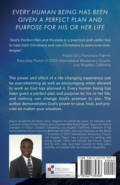 Every human being has been given a perfect plan and purpose for his or her life. "God's Perfect Plan and Purpose is a practical and useful tool to help both Christians and non-Christians to overcome challenges." Pastor (Dr.) Francesca Fajinmi Executive Pastor of DIOS International Missionary Church, Los Angeles, California The power and effect of a life-changing experience can be overwhelming as well as encouraging when allowed to work as God has planned it. Every human being has been given a perfect plan and purpose for his or her life, and nothing can change God's promise to you. The author demonstrates God's power to save, heal, and provide no matter your situation.