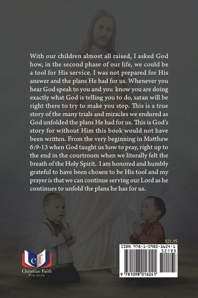With our children almost all raised, I asked God how, in the second phase of our life, we could be a tool for His service. I was not prepared for His answer and the plans He had for us. Whenever you hear God speak to you and you know you are doing exactly what God is telling you to do, satan will be right there to try to make you stop. This is a true story of the many trials and miracles we endured as God unfolded the plans He had for us. This is God's story for without Him this book would not have been written. From the very beginning in Matthew 6:9-13 when God taught us how to pray, right up to the end in the courtroom when we literally felt the breath of the Holy Spirit. I am honored and humbly grateful to have been chosen to be His tool and my prayer is that we can continue serving our Lord as he continues to unfold the plans he has for us.