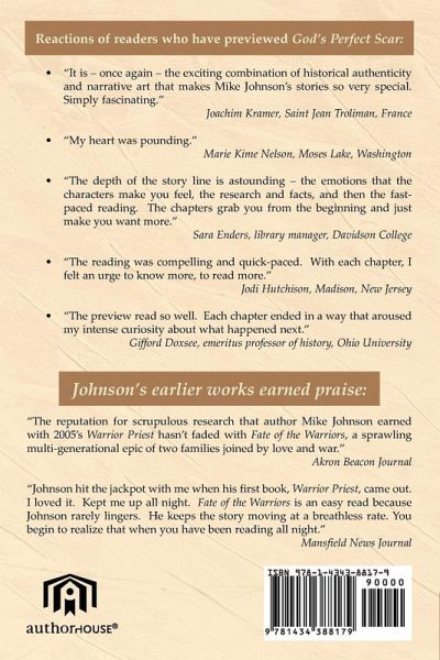 History comes alive in God's Perfect Scar. A survivor of the 1944 Warsaw Uprising finds himself in Auschwitz, working with a woman prisoner to plan and implement a harrowing mass escape. A former Polish lancer turned airborne trooper turned English instructor at the University of Warsaw finds himself targeted by the Kremlin-controlled secret police. Two brothers find themselves conscripted by a pair of ambitious rulers, each itching to fire the first shot in a war that will ensnare soldiers and nurses from America, Britain, New Zealand and Korea. An American priest, a former World War II chaplain, finds himself playing street soccer in Rome and plotting a rescue in Warsaw. Bullets and shrapnel leave lasting scars - as do polio, treachery and guilt. Painstakingly researched, God's Perfect Scar is the story of ordinary people swept up in extraordinary, history-changing upheavals, contending with unrelenting stresses and making life-altering choices. During his research, Johnson learned about Aline Gartner, lost in the mists of time and history. In the pages of God's Perfect Scar, he "brings back to life" this remarkably courageous woman. From Auschwitz to Cracow to Warsaw, London, Moscow, Beijing, Kaesong, Seoul and small town America, God's Perfect Scar takes readers on a journey that provides a different and broader perspective on major happenings that have been shaping history for the last 60 years. As with Johnson's earlier works, Warrior Priest and Fate of the Warriors, the pacing in God's Perfect Scar is brisk, the tension palpable and the outcomes unpredictable.