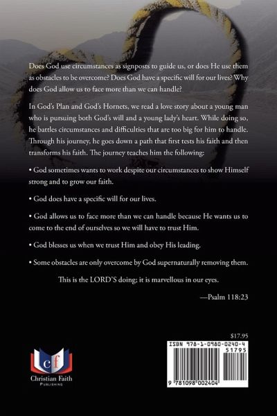 Does God use circumstances as signposts to guide us, or does He use them as obstacles to be overcome? Does God have a specific will for our lives? Why does God allow us to face more than we can handle? In God's Plan and God's Hornets, we read a love story about a young man who is pursuing both God's will and a young lady's heart. While doing so, he battles circumstances and difficulties that are too big for him to handle. Through his journey, he goes down a path that first tests his faith and then transforms his faith. The journey teaches him the following: • God sometimes wants to work despite our circumstances to show Himself strong and to grow our faith. • God does have a specific will for our lives. • God allows us to face more than we can handle because He wants us to come to the end of ourselves so we will have to trust Him. • God blesses us when we trust Him and obey His leading. • Some obstacles are only overcome by God supernaturally removing them. This is the LORD'S doing; it is marvellous in our eyes. -Psalm 118:23