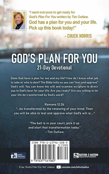 Does God have a plan for me and my life? How do I know what job to take or whom to date? The Bible tells us you can "test and approve" God's Will. You can know His will and examine Scripture to provide God's direction for your life. The book of Romans tells us that as we are transformed by God, we are able to discern His Will. Are you ready and willing to let your life be transformed by God's Word and His Holy Spirit? In less than five minutes each day this book will walk you through practical steps in Scripture in order to be transformed by God and to better understand His plan for your life. Endorsement: I want everyone to get ready for "God's Plan for You," written by Tim Outlaw. God has plans for you and your life pick up this book today. %Chuck Norris ChuckNorris.com I am so grateful that almost twenty years into our friendship, Tim Outlaw is still speaking into my life. I cannot think of a better person to guide each of us towards God's direction. I have watched (at times with horror) as Tim has learned and lived out each of the lessons that he teaches us in this book. This devotional uses Star Wars, Socks and Sandals, and pant-less hunting trips to explain deep concepts about God. If that doesn't pique your interest, I am not sure what will. That's who Tim has always been. Someone who uses his embarrassing moments and mistakes to make the people around him better... It is my hope that over the next 21 days, that you too, will lean in and experience the author of your story. I pray that you too, will hear God's voice whispering and prompting your steps. Most of all, I hope that you will experience God's plan for you. %Zachary Taylor Pastor. Leader. Speaker. ZacharyWtaylor.com "An unexamined life is not worth living" (Socrates) certainly is true of all of us who want to understand God better and grow closer to Him. "God's Plan for You" leads the reader on a fascinating journey of introspection and fresh discovery that is both practical and inspirational as we reassess, refocus, and look to our future with faith. "God's Plan for You" is biblically based, interesting, and worth reading at the start of your day. %Rev. David Arrol Macfarlane Author, Ignite Your Life. DavidaMacfarlane.com About the Author: Tim grew up knowing the reality of God from a young age but struggled how to understand His will. After more than fifteen years of seeking Jesus, being transformed by His Word and Holy Spirit, and serving the Church around the world, he has gained confidence in knowing God's plan for his life. Tim wrote this book to share the wisdom he has gained in understanding God's personal plan for every follower of Christ.
