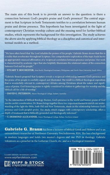 The main aim of this book is to provide an answer to the question: is there a connection between God's people's praise and God's presence? The central argument is that Scripture in both Testaments testifies to a correlation between human praise and divine presence. This hypothesis has been investigated in the light of contemporary Christian worship culture and the ensuing need for further biblical studies, which represents the background for this investigation. The study achieves the above aim by applying biblical theology as a discipline and canonical and intertextual models as a method.
