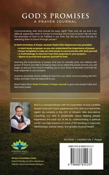 Having trouble communicating with God? A deeper relationship with the Almighty is within reach. Worried you're not receiving what the Lord has promised? Does coming up with the right words to speak to Him leave you frustrated? Unsure why praying is essential to your spiritual life? With over twenty years of ministry and service under his belt, pastor and author Rick Stephenson has extensive experience with God answering direct pleas. Now he's here to share the path to uninterrupted access with your Heavenly Father through the divine gift of grace and mercy. God's Promises: A Prayer Journal is a straightforward and helpful guide to your time of devotion and expression. Through a short study of supplication, useful examples provided in prayer templates, and a biblical methodology of His responses, you will learn the importance of daily and consistent communication with the Most High. And understanding that you can petition Him anytime and anywhere, you'll build up confidence in your faith and your place as a child of God. In God's Promises: A Prayer Journal, you'll discover: - An easy-to-understand Bible study on making requests to the Lord - Personal stories that illustrate the power and affirmed nature of His Word - How to determine when and if God is speaking to you - A guided notebook to write, declare, and document your thoughts so you can be assured in your message to our loving Heavenly Father -Ways to recognize how He is meeting you during your times of worship, and much, much more! God's Promises: A Prayer Journal is a must-have resource for those struggling to express themselves to the Lord. If you like simple advice, strengthening your beliefs, and growing your prayer life, then you'll adore Pastor Rick Stephenson's Bible-based instruction. Buy God's Promises: A Prayer Journal today to feel His presence!