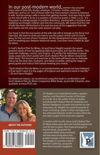 This best-selling book by Gil & Dana Stieglitz is a support book for wives to help them learn about what motivates and energizes their husband to be the man she hopes he'll become. Being a wife is more than just getting married; it's more than simply getting her needs met or having stability or a life companion-it's about loving, guiding, and growing into the woman God calls her to be. God has a plan for women who have committed to the role of wife. This may seem outdated, even "radical," today, but the truth of God's marriage principles are timeless. God's Radical Plan for Wives delves deep into the seven greatest needs of men by applying biblical principles and real-life stories. Learn how a wife can honor God, help her husband become a success, build a healthy marriage, and get her own deepest relational needs met. This book will challenge, convict, and inspire women for positive change in marriage. Each lesson has practical tools and exercises to guide wives to a new perspective about their spouses. It is perfect for individual or group study, especially when paired with God's Radical Plan for Wives Companion Bible Study by Jennifer Edwards. The lessons and exercises in these two books will equip wives with everything she needs to become a wife of great joy, love, and honor for their husband and family. They may even help to save her marriage.