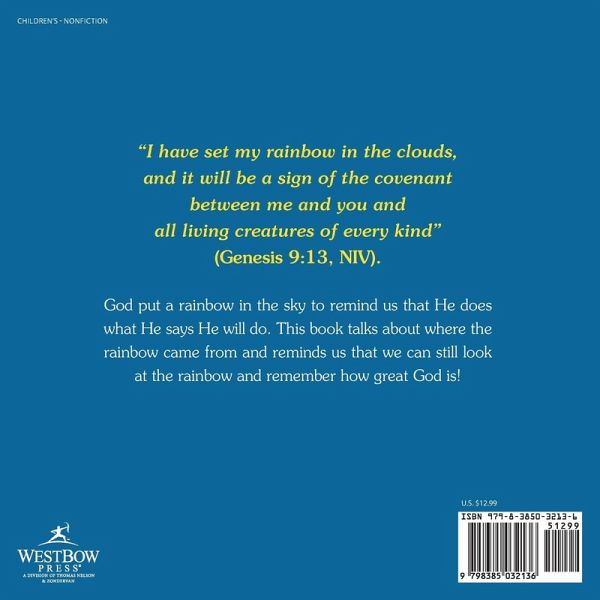 "I have set my rainbow in the clouds, and it will be a sign of the covenant between me and you and all living creatures of every kind" (Genesis 9:13, NIV). God put a rainbow in the sky to remind us that He does what He says He will do. This book talks about where the rainbow came from and reminds us that we can still look at the rainbow and remember how great God is!