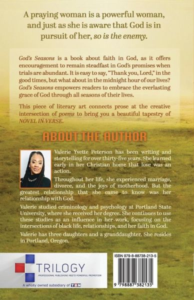A praying woman is a powerful woman, and just as she is aware that God is in pursuit of her, so is the enemy. God's Seasons is a book about faith in God, as it offers encouragement to remain steadfast in God's promises when trials are abundant. It is easy to say, "Thank you, Lord," in the good times, but what about in the midnight hour of our lives? God's Seasons empowers readers to embrace the everlasting grace of God through all seasons of their lives. This piece of literary art connects prose at the creative intersection of poems to bring you a beautiful tapestry of NOVEL IN VERSE.