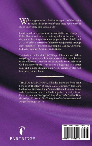 What happens when a familiar passage in the Bible begins to sound like your own life and those verses want to shape a new story only you can tell? Confronted by that question when his life was disrupted, Father Ramadhani turned to writing as his tool to search into the depths. In this spiritual monograph on Hosea 2:4-25 and 3:1-5, he offers a narrative of a homecoming journey through eight metaphors-Prostituting, Stripping, Caging, Unveiling, Seducing, Purging, Owning, and Sitting. This is the second book in his 'Trilogy of Redemption'. When everything is gone, the only option is to walk into the unknown in the wilderness. Utter loss can be the only way to rediscover God and reinvent life. This leads to a bigger grace, a better gain, and a more liberating path. God's seduction plan will bring every sinner home.