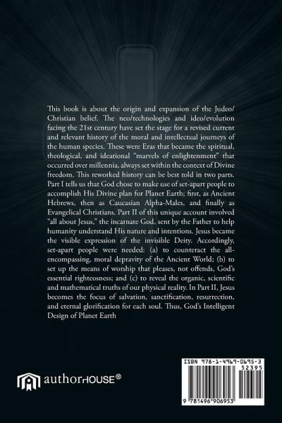 This book is about the origin and expansion of the Judeo/Christian belief. The neo/technologies and ideo/evolution facing the 21st century have set the stage for a revised current and relevant history of the moral and intellectual journeys of the human species. These were Eras that became the spiritual, theological, and ideational "marvels of enlightenment" that occurred over millennia, always set within the context of Divine freedom. This reworked history can be best told in two parts. Part I tells us that God chose to make use of set-apart people to accomplish His Divine plan for Planet Earth; first, as Ancient Hebrews, then as Caucasian Alpha-Males, and finally as Evangelical Christians. Part II of this unique account involved "all about Jesus," the incarnate God, sent by the Father to help humanity understand His nature and intentions. Jesus became the visible expression of the invisible Deity. Accordingly, set-apart people were needed: (a) to counteract the all-encompassing, moral depravity of the Ancient World; (b) to set up the means of worship that pleases, not offends, God's essential righteosness; and (c) to reveal the organic, scientific and mathematical truths of our physical reality. In Part II, Jesus becomes the focus of salvation, sanctification, resurrection, and eternal glorification for each soul. Thus, God's Intelligent Design of Planet Earth