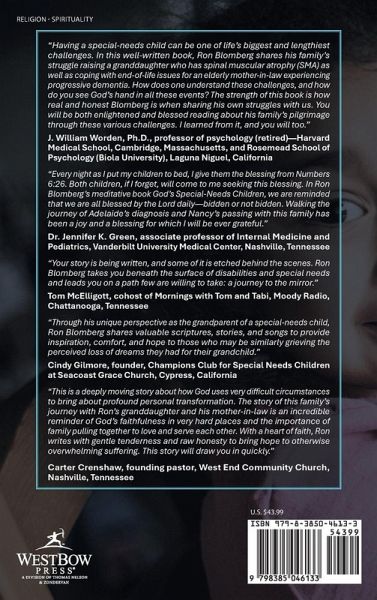 God's Special-Needs Children: Lessons of Faith Learned by Families of Those with Disabilities Find Hope, Guidance, and Strength in the Midst of Life's Most Challenging Journey Are you raising, caring for, or supporting a child with special needs? Do you sometimes feel overwhelmed, isolated, or uncertain about God's purpose in your family's unique journey? This transformative book offers the comfort and practical wisdom you've been searching for. Ron Blomberg shares his family's deeply personal story of raising a granddaughter with spinal muscular atrophy (SMA) while simultaneously navigating end-of-life care for a mother-in-law with progressive dementia. Through raw honesty and heartfelt reflection, he reveals: ¿ How to find God's hand in even the most difficult circumstances ¿ Practical spiritual insights that bring comfort during overwhelming moments ¿ Real strategies for maintaining faith and hope when facing uncertain futures ¿ Ways to transform your perspective on disability, caregiving, and family relationships What This Book Will Do For You: ¿ Provide comfort knowing you're not alone in your challenging journey ¿ Offer spiritual guidance specifically tailored to special needs families ¿ Help you discover unexpected blessings in the midst of daily struggles ¿ Give you permission to acknowledge your struggles while maintaining faith ¿ Equip you with strength-building scriptures, stories, and insights Perfect for parents, grandparents, extended family members, pastors, caregivers, and anyone touched by the special needs community. "The strength of this book is how real and honest Blomberg is when sharing his own struggles. You will be both enlightened and blessed reading about his family's pilgrimage through these various challenges." - J. William Worden, Ph.D., Professor of Psychology (retired)-Harvard Medical School Hardcover - March 23, 2025 By Ron Blomberg (Author) Find the courage, faith, and community you need to embrace your unique family journey today.