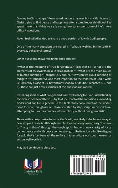 Coming to Christ at age fifteen saved not only my soul but my life. I came to Christ trying to find peace and happiness after a tumultuous childhood. I've spent more than thirty years learning how to answer some of life's more difficult questions. Now, I feel called by God to share a good portion of it with God's people. One of the many questions answered is, "What is walking in the spirit in everyday behavioral terms?" Other questions answered in this book include: "What is the meaning of true forgiveness?" (chapter 5). "What are the elements of trustworthiness in relationships?" "What are the main causes of human suffering?" (chapter 2, 5 and 7). "How can we avoid suffering or mitigate it?" (chapter 5). And most important to the children of God, "What is God really asking of us, beyond any shadow of doubt?" (chapter 2, 5, and 6). These are just a few examples of the questions answered. By sharing some of what I've gleamed from my life long focus on understanding the Bible in behavioral terms, I try to dispel much of the confusion surrounding God's word and life in general. In this Bible study book, much of the work is done for you, though not all. I take you step by step, scripture by scripture, attempting to turn the complex into simplicity, without being simplistic. Those with a deep desire to know God's will, are likely to be blown away at how simple it really is. Although, simple does not always mean easy. You have to "hang in there" through the rough spots, but with new clarity of focus comes peace and with peace comes strength. I believe it is a lot like digging for gold that's just beneath the surface. It takes a little work but the rewards will be well worth it. May God continue to bless you.