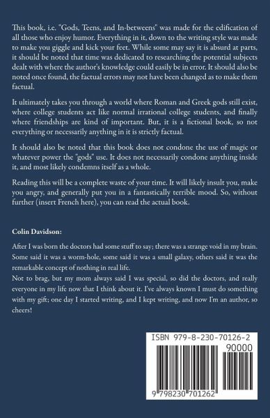 This book, i.e. "Gods, Teens, and In-betweens" was made for the edification of all those who enjoy humor. Everything in it, down to the writing style was made to make you giggle and kick your feet. While some may say it is absurd at parts, it should be noted that time was dedicated to researching the potential subjects dealt with where the author's knowledge could easily be in error. It should also be noted once found, the factual errors may not have been changed as to make them factual. It ultimately takes you through a world where Roman and Greek gods still exist, where college students act like normal irrational college students, and finally where friendships are kind of important. But, it is a fictional book, so not everything or necessarily anything in it is strictly factual. It should also be noted that this book does not condone the use of magic or whatever power the "gods" use. It does not necessarily condone anything inside it, and most likely condemns itself as a whole. Reading this will be a complete waste of your time. It will likely insult you, make you angry, and generally put you in a fantastically terrible mood. So, without further (insert French here), you can read the actual book.