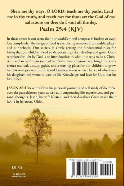 Gods' Template for life; By Dad.. is a must have for any parent, grandparent, or child that is looking for an introduction to Jesus and a road map for life. Join author Jason Ashba as he reveals Gods' template to your life as seen through a dads' eyes. Written for his daughter in a easy, simple to follow format. This book acts as a quick reference and an inspiration to all highlighting and answering life's questions.