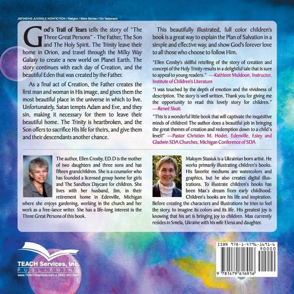 God's Trail of Tears tells the story of "The Three Great Persons"-The Father, The Son, and The Holy Spirit. The Trinity leave their home in Orion and travel through the Milky Way Galaxy to create a new world on Planet Earth. The story continues with each day of Creation, and the beautiful Eden that was created by the Father. As a final act of Creation, the Father creates the first man and woman in His image, and gives them the most beautiful place in the universe in which to live. Unfortunately, Satan tempts Adam and Eve, and they sin, making it necessary for them to leave their beautiful home. The Trinity is heartbroken, and the Son offers to sacrifice His life for theirs, and give them and their descendants another chance.This beautifully illustrated, full-color children's book is a great way to explain the plan of salvation in a simple and effective way, and show God's forever love to all those who choose to follow Him.