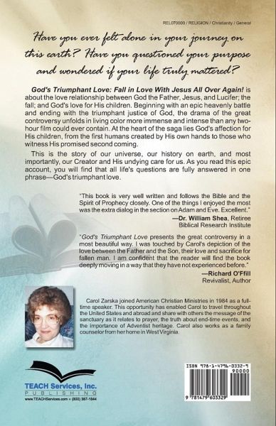 Have you ever felt alone in your journey on this earth? Have you questioned your purpose and wondered if your life truly mattered? God's Triumphant Love: Fall in Love With Jesus All Over Again! is about the love relationship between God the Father, Jesus, and Lucifer; the fall; and God's love for His children. Beginning with an epic heavenly battle and ending with the triumphant justice of God, the drama of the great controversy unfolds in living color more immense and intense than any two-hour film could ever contain. At the heart of the saga lies God's affection for His children, from the first humans created by His own hands to those who witness His promised second coming. This is the story of our universe, our history on earth, and most importantly, our Creator and His undying care for us. As you read this epic account, you will find that all life's questions are fully answered in one phrase-God's triumphant love. "This book is very well written and follows the Bible and the Spirit of Prophecy closely. One of the things I enjoyed the most was the extra dialog in the section on Adam and Eve. Excellent." Dr. William Shea, Retiree, Biblical Research Institute "God's Triumphant Love presents the great controversy in a most beautiful way. I was touched by Carol's depiction of the love between the Father and the Son, their love and sacrifice for fallen man. I am confident that the reader will find the book deeply moving in a way that they have not experienced before." Richard O'Ffill, Revivalist, Author