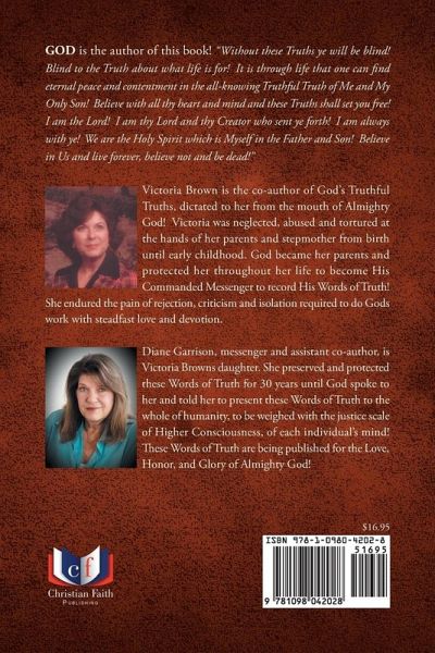 Victoria Brown is the coauthor of God's Truthful Truths, dictated to her from the mouth of Almighty God! Victoria was neglected, abused, and tortured at the hands of her parents and stepmother from birth until early childhood. God became her parents and protected her throughout her life to become His Commanded Messenger to record His Words of Truth! She endured the pain of rejection, criticism, and isolation required to do God's work with steadfast love and devotion. Diane Garrison, messenger and assistant coauthor, is Victoria Brown's daughter. She preserved and protected these Words of Truth for thirty years until God spoke to her and told her to present these Words of Truth to the whole of humanity, to be weighed with the justice scale of Higher Consciousness, of each individual's mind! These Words of Truth are being published for the Love, Honor, and Glory of Almighty God!