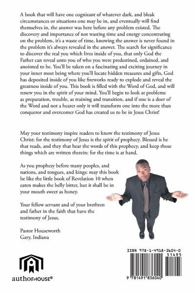 A book that will have one cognizant of whatever dark, and bleak circumstances or situations one may be in, and eventually will find themselves in, the answer was here before any problem existed. The discovery and importance of not wasting time and energy concentrating on the problem, it's a waste of time, knowing the answer is never found in the problem it's always revealed in the answer. The search for significance to discover the real you which lives inside of you, that only God the Father can reveal unto you of who you were predestined, ordained, and anointed to be. You'll be taken on a fascinating and exciting journey in your inner most being where you'll locate hidden treasures and gifts, God has deposited inside of you like fireworks ready to explode and reveal the greatness inside of you. This book is filled with the Word of God, and will renew you in the spirit of your mind. You'll begin to look at problems as preparation, trouble, as training and transition, and if one is a doer of the Word and not a hearer only it will transform one into the more than conqueror and overcomer God has created us to be in Jesus Christ! May your testimony inspire readers to know the testimony of Jesus Christ: for the testimony of Jesus is the spirit of prophecy. Blessed is he that reads, and they that hear the words of this prophecy, and keep those things which are written therein: for the time is at hand. As you prophesy before many peoples, and nations, and tongues, and kings: may this book be like the little book of Revelation 10 when eaten makes the belly bitter, but it shall be in your mouth sweet as honey. Your fellow servant and of your brethren and father in the faith that have the testimony of Jesus. Pastor Houseworth Gary, Indiana