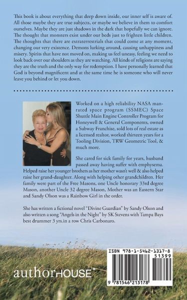 This book is about everything that deep down inside, our inner self is aware of. All those maybe they are true subjects, or maybe we believe in them to comfort ourselves. Maybe they are just shadows in the dark that hopefully we can ignore. The thought that monsters exist under our beds just to frighten little children. The thoughts that there are extraterrestrials that could come at any moment, changing our very existence. Demons lurking around, causing unhappiness and misery. Spirits that have not moved on, making us feel uneasy, feeling we need to look back over our shoulders as they are watching. All kinds of religions are saying they are the truth and the only way for redemption. I have personally learned that God is beyond magnificent and at the same time he is someone who will never leave you behind or let you down.