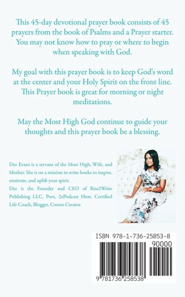 "God's Voice for Prayers: 45 Psalms & Prayers" includes 45 Powerful Prayers and Devotionals from the Book of Psalms to Strengthen Your Faith and Deepen Your Connection with God. Finding the right words to pray can be difficult. Especially during seasons of pain, doubt, or uncertainty. If you've ever struggled with how to speak to God or wondered what to say when life feels overwhelming, God's Voice for Prayers will guide you back to His Word and remind you that He's always listening. This inspiring prayer book draws wisdom and comfort from the Book of Psalms, offering 45 powerful prayers to help you renew your faith, invite peace into your heart, and strengthen your daily walk with God. Whether used for morning devotionals, evening reflection, or quiet meditation, each prayer helps you align your spirit with God's promises and open your heart to His presence. Inside you'll find: 45 heartfelt prayers rooted in the Psalms Prayer starters to help you speak from your heart Encouraging scriptures to bring peace and direction A devotional structure perfect for daily prayer or journaling Inspiration to trust, surrender, and grow in faith Let God's Voice for Prayers be your companion in moments of gratitude, struggle, and reflection. As you read and pray, may the Holy Spirit speak through you and lead you closer to the heart of God. Perfect for:Christians seeking daily prayer guidance Those new to prayer or devotional journaling Spiritual gifts for friends, family, or church members Anyone desiring peace, strength, and a deeper relationship with God May the Most High continue to guide your path, and may this book renew your prayer life and your faith journey.