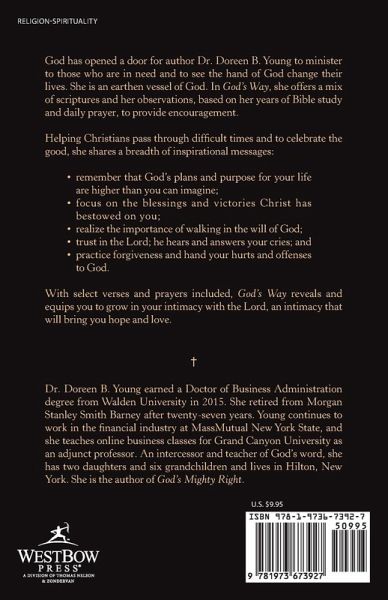 God has opened a door for author Dr. Doreen B. Young to minister to those who are in need and to see the hand of God change their lives. She is an earthen vessel of God. In God's Way, she offers a mix of scriptures and her observations, based on her years of Bible study and daily prayer, to provide encouragement. Helping Christians pass through difficult times and to celebrate the good, she shares a breadth of inspirational messages: remember that God's plans and purpose for your life are higher than you can imagine; focus on the blessings and victories Christ has bestowed on you; realize the importance of walking in the will of God; trust in the Lord; he hears and answers your cries; and practice forgiveness and hand your hurts and offenses to God. With select verses and prayers included, God's Way reveals and equips you to grow in your intimacy with the Lord, an intimacy that will bring you hope and love.