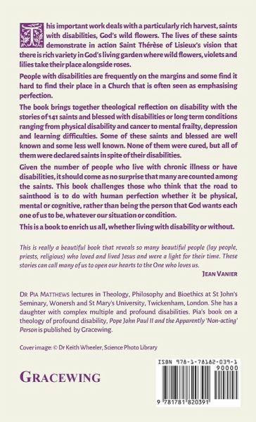 This important book is about a particularly rich harvest, saints with disabilities, God's wild flowers. St Thérèse of Lisieux speaks of God's living garden made of a great variety of flowers. People with disabilities are often on the margins and some find it hard to find their place in a Church that is often seen as emphasizing perfection. This book tells the stories of 141 saints and blessed, some well known and some less well known. All of them had disabilities or long term conditions ranging from cancer, physical disability to mental frailty, depression and learning difficulties. None of them were cured, and none of them were declared saints in spite of their disabilities. Given the number of people who are sick or have disabilities, it should come as no surprise that many are counted among the saints.