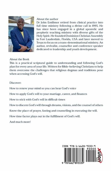 About the Book This is a practical scriptural guide to understanding and following God's plan for every area of your life. Written for Bible-believing Christians to help them overcome the challenges that religious dogmas and traditions pose when accessing God's will. Discover: How to renew your mind so you can hear God's voice How to apply God's will to your marriage, career, and finances How to stick with God's will in difficult times How to discern God's will through dreams, visions, and the counsel of others Know the place of prayer, fasting and counselling in executing the will. How time factor plays out in the fulfillment of God's will. And much more! About the author Dr John Emilimor retired from clinical practice into full time ministry following a divine call in 1995. He has since been engaged in a global apostolic and prophetic teaching ministry with diverse gifts of the Holy Spirit. He founded Dominion Christian Assembly in Fort Lauderdale, Florida, USÁ and later moved to Texas to focus on a trans-denominational ministry. An author, revivalist, counsellor and conference speaker dedicated to leadership and youth development.