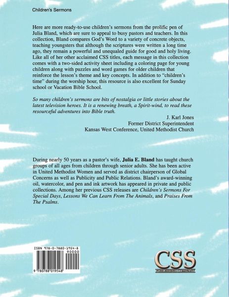 Here are more ready-to-use children's sermons from the prolific pen of Julia Bland that are sure to appeal to busy pastors and teachers. In this collection, Bland compares God's word to a variety of concrete objects, teaching youngsters that although the scriptures were written a long time ago, they remain a powerful and unequaled guide for good and holy living. Like all of her other acclaimed CSS titles, each message in this collection comes with a two-sided activity sheet including a coloring page for young children along with puzzles and word games for older children that reinforce the lesson's theme and key concepts. In addition to "children's time" during the worship hour, this resource is also excellent for Sunday school or Vacation Bible School. So many children's sermons are bits of nostalgia or little stories about the latest television heroes. It is a renewing breath, a Spirit-wind, to read these resourceful adventures into Bible truth. J. Karl Jones Former District Superintendent Kansas West Conference, United Methodist Church During nearly fifty years as a pastor's wife, Julia E. Bland has taught church groups of all ages from children through senior adults. She has been active in United Methodist Women and served as district chairperson of Global Concerns as well as Publicity and Public Relations. Bland's award-winning oil, watercolor, and pen and ink artwork has appeared in private and public collections. Among her previous CSS releases are Children's Sermons for Special Days, Lessons We Can Learn From the Animals, and Praises From the Psalms.