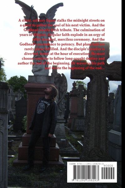 A silent, solitary figure stalks the midnight streets on a quest to gather the soul of his next victim. And the Godhead awaits fresh tribute. The culmination of years of diligent, singular faith explode in an orgy of offal-streaked, merciless ceremony. And the Godhead's ascendence to potency. But plans laid are rarely plans fulfilled. And the disciple's resolve is diverted, tested at the hour of execution. He must choose: contrive to follow long-sought destiny and author the end of the beginning. Or waver in his path and invite the beginning of the end...