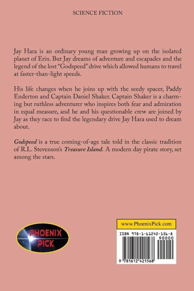 Jay Hara is an ordinary young man growing up on the isolated planet of Erin. But Jay dreams of adventure and escapades and the legend of the lost "Godspeed" drive which allowed humans to travel at faster-than-light speeds. *** His life changes when he joins up with the seedy spacer, Paddy Enderton and Captain Daniel Shaker. Captain Shaker is a charming but ruthless adventurer who inspires both fear and admiration in equal measure, and he and his questionable crew are joined by Jay as they race to find the legendary drive Jay Hara used to dream about. *** Godspeed is a true coming-of-age tale told in the classic tradition of R.L. Stevenson's Treasure Island. A modern day pirate story, set among the stars.