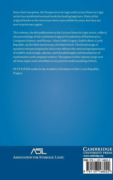 Since their inception, the Perspectives in Logic and Lecture Notes in Logic series have published seminal works by leading logicians. Many of the original books in the series have been unavailable for years, but they are now in print once again. This volume, the sixth publication in the Lecture Notes in Logic series, collects the proceedings of the conference 'Logical Foundations of Mathematics, Computer Science, and Physics - Kurt Gödel's Legacy', held in Brno, Czech Republic, on the 90th anniversary of Gödel's birth. The broad range of speakers who participated in this event affirms the continuing importance of Gödel's work in logic, physics, and the philosophy and foundations of mathematics and computer science. The papers in this volume range over all these topics and contribute to our present understanding of them.